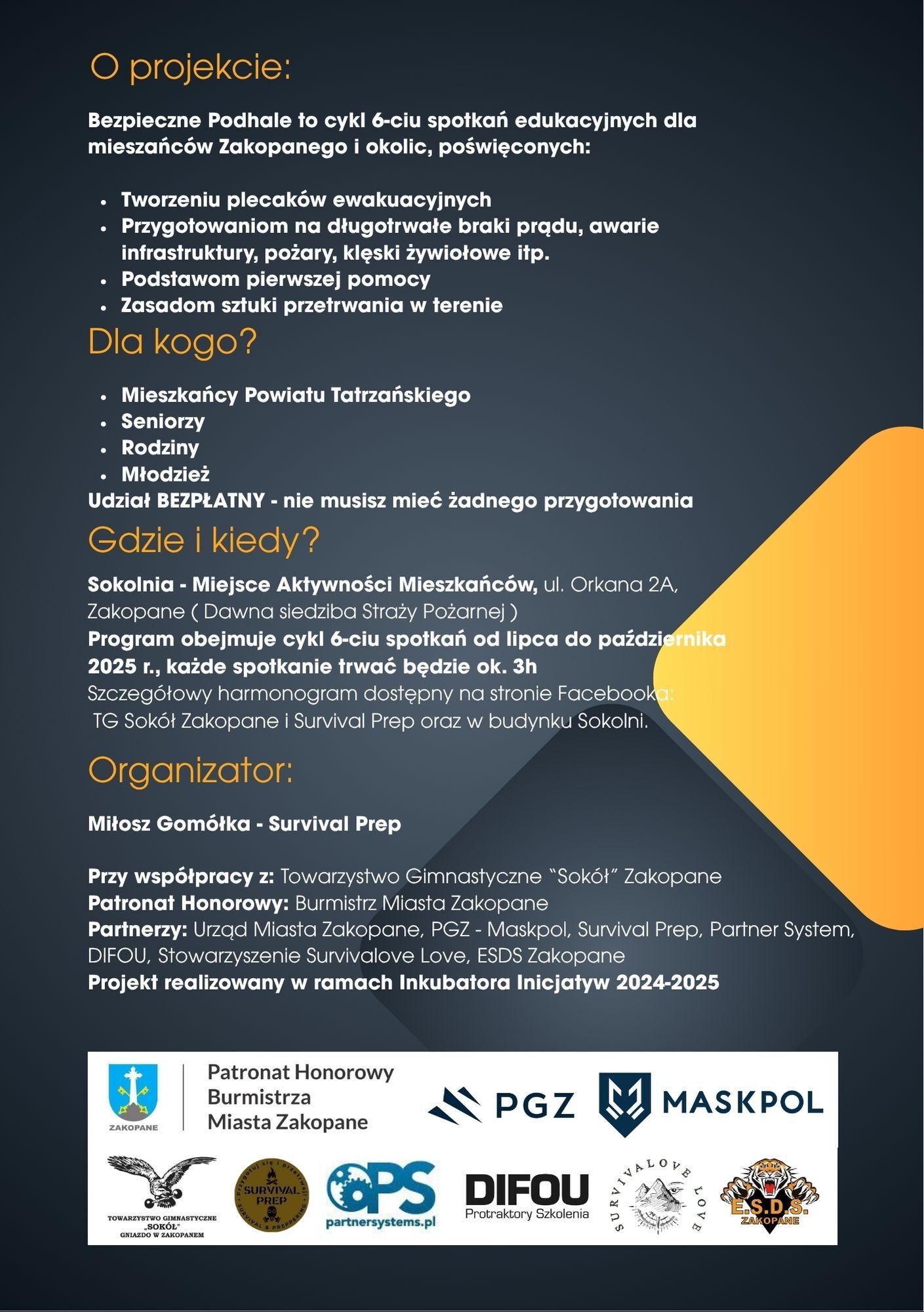 W lipcu 2025 roku w Zakopanem rozpocznie się wyjątkowy, bezpłatny program edukacyjny „Bezpieczne Podhale”, skierowany do mieszkańców Podhala – seniorów, rodzin z dziećmi oraz młodzieży. Projekt realizowany będzie w Sokolni przy ul. Orkana 2 a i potrwa do października 2025 roku.